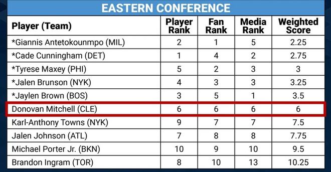 先说东部,首发五人不管是球员投票、球迷投票还是媒体投票都在前五,因此排在第六的米切尔最终排名系数与前五人其实有不小差距,即便三项投票之一能往上提升一点,米切尔大概率也无法挤掉布朗或者布伦森。