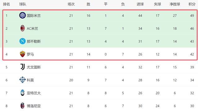 在拿到3分之后,AC米兰目前继续排名第二,他们落后榜首的国米3分,本赛季依然有机会逆袭争冠。值得一提的是,罗马本轮也在客场2-0拿下都灵,他们已经反超尤文,排名上升到第4位。本赛季,罗马已经成为意甲大黑马,他们将与国米、AC米兰和那不勒斯竞争冠军。本轮联赛,意甲4强全胜,也逐渐拉开了和其他球队的差距。从目前来看,国米依然是头号热门,不过他们对阵强队战绩不佳,这已经成为国米的短板。在剩下的比赛中,国米还要遇到AC米兰和尤文等强队,一旦再轻易丢分,国米恐怕会被身后的对手反超。