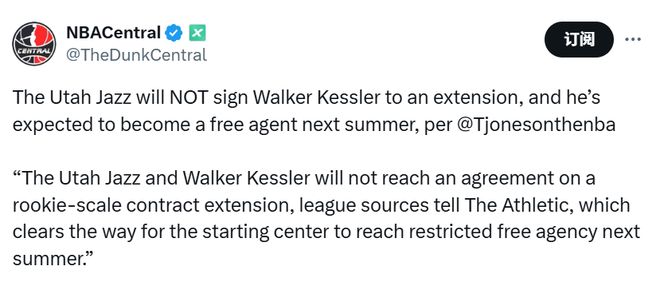 北京时间9月25日,据联盟消息人士向The Athletic透露,犹他爵士队与中锋沃克-凯斯勒未能就新秀合同的续约事宜达成协议,这意味着他将在明年夏天成为受限制自由球员。