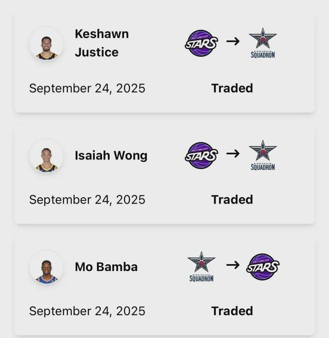北京时间9月27日,据爵士记者Ben Anderson报道,爵士附属球队盐湖城星光队,将以赛亚-王和基肖恩-贾斯蒂斯送至鹈鹕附属的伯明翰中队,2换1交易得到班巴。新赛季班巴将代表盐湖城星光队出战发展联盟比赛,正式告别NBA。