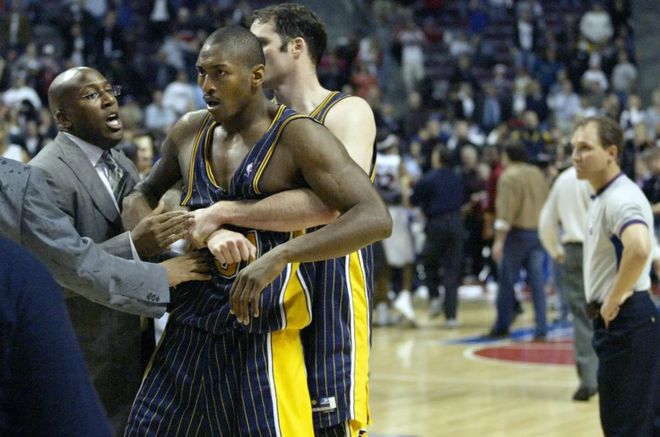 2004年奥本山宫事件,正是由本・华莱士的“一推”引发。当时比赛临近结束,阿泰斯特对本・华莱士犯规动作过大,本・华莱士瞬间暴怒,一把将阿泰斯特推到数米开外。要知道,本・华莱士身高2.06米,体重118公斤,爆发力极强,这一推差点让阿泰斯特摔倒。也正是这一推,点燃了后续的“观众席混战”——阿泰斯特被激怒后冲进观众席,引发大规模冲突。