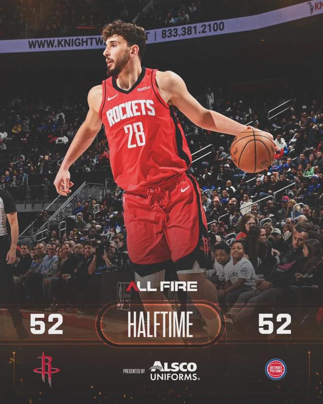 第二节活塞外线依然找不到手感,单节三分9中1。上半场活塞三分球15中2,命中率只有13.3%。火箭三分16中4,命中率25%也没好多少。活塞第二节在内线连续得手,单节得到32分。上半场结束,火箭和活塞52-52打平了。