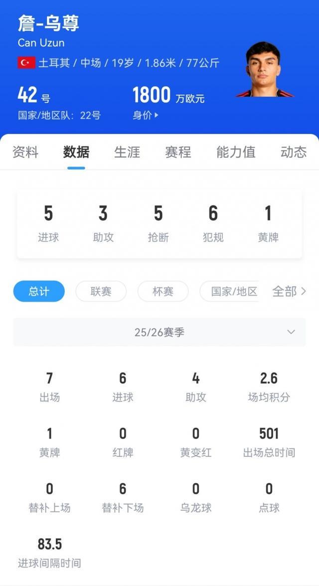 法鹰上新货19岁中场乌尊德甲5轮5球3助身价1800万去年被疯抢