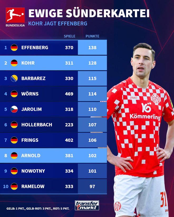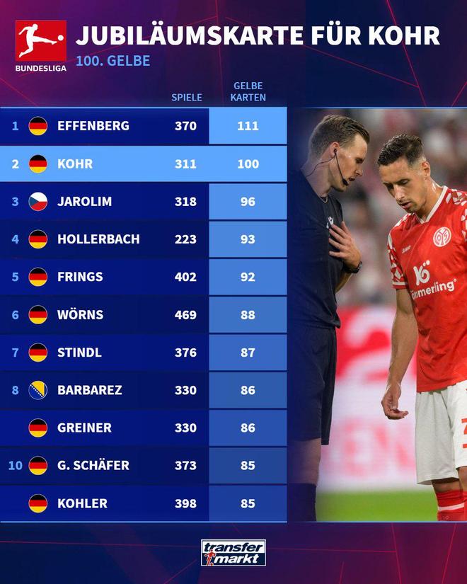 黄卡大师,美因茨后卫科尔是德甲历史上唯二染黄破百的球员