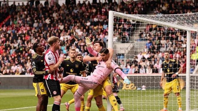 比赛第14分钟,布伦特福德获得角球机会。在防守过程中,电视转播镜头捕捉到令人啼笑皆非的一幕:马奎尔并未盯防对方进攻球员,而是转身紧紧“贴防”自家门将奥尔特亚·巴因迪尔,仿佛担心他会突然倒地。