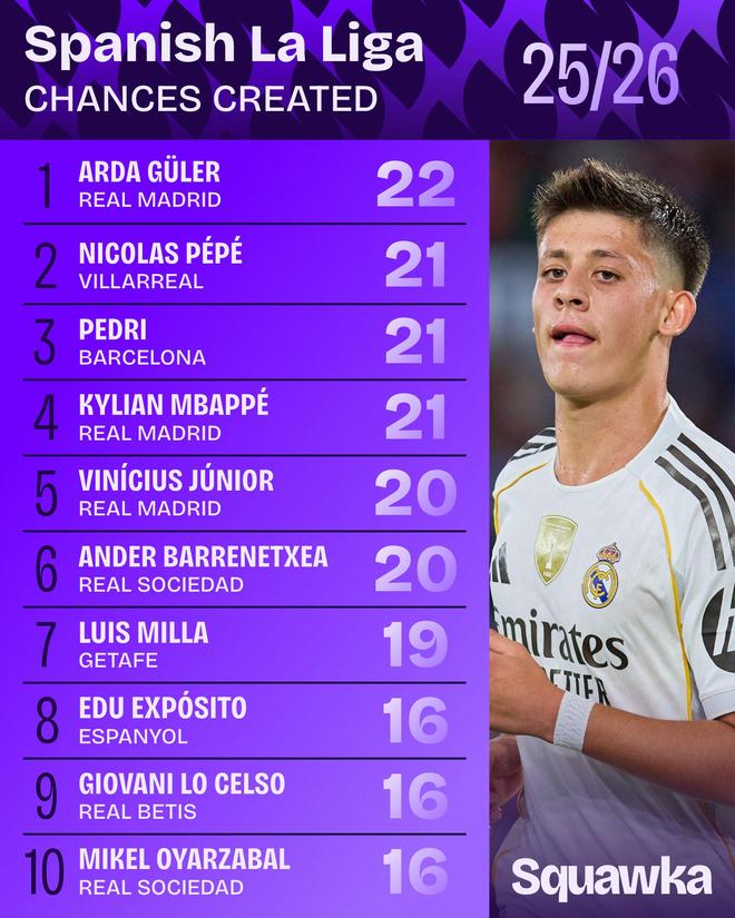 雷速体育10月7日宣 外媒统计了本赛季西甲创造进球机会次数排行榜,皇马中场居莱尔以22次居首,尼古拉斯·佩佩、佩德里以21次紧随其后。