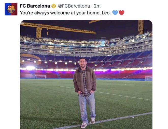 各路媒体也纷纷撰文,所有人都希望梅西能够上演落叶归根的剧情,为自己的生涯画上一个神话一般的句号。巴萨官方当然也没有闲着,他们顺势抛出橄榄枝,发表动态表示:随时欢迎你回家!