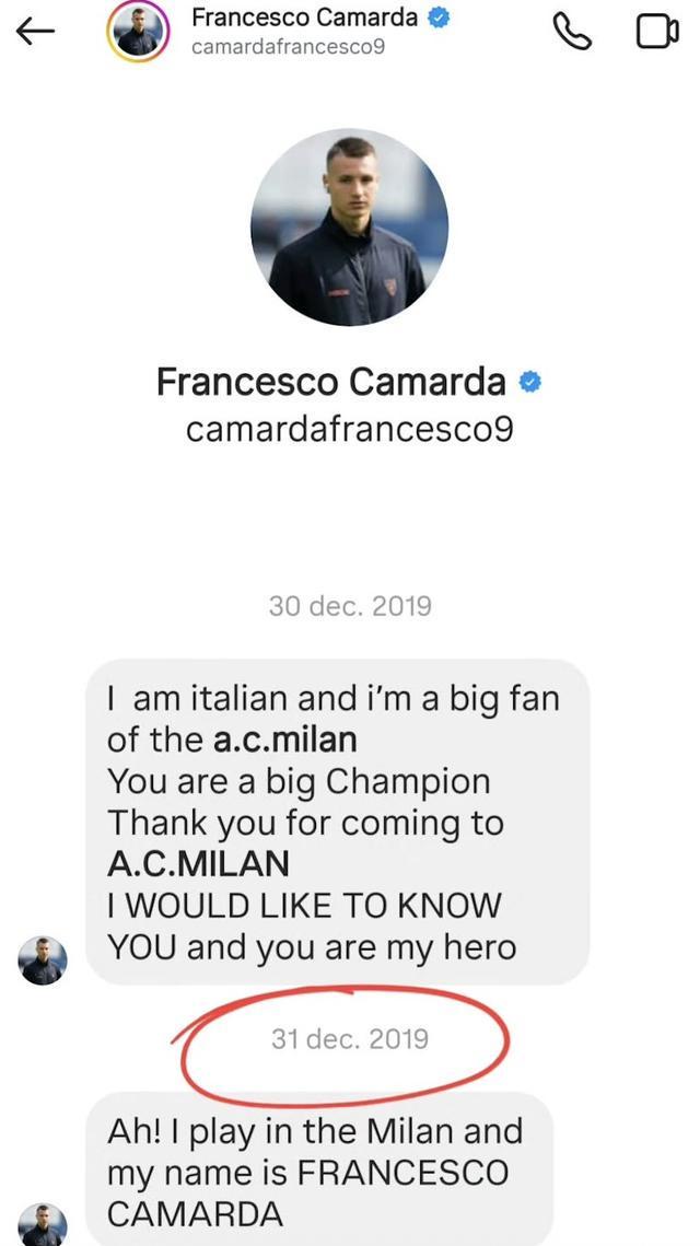 截图显示,卡马尔达在2019年12月通过社交媒体给伊布发了私信,他写道:“我是意大利人,也是AC米兰的忠实球迷。你是伟大的冠军,谢谢你来到AC米兰。我很想认识你,你是我的英雄。”
