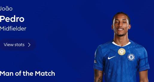 英超第11轮,切尔西主场3-0击败狼队,此役打入一球的切尔西前锋若昂-佩德罗当选英超官方全场最佳球员。